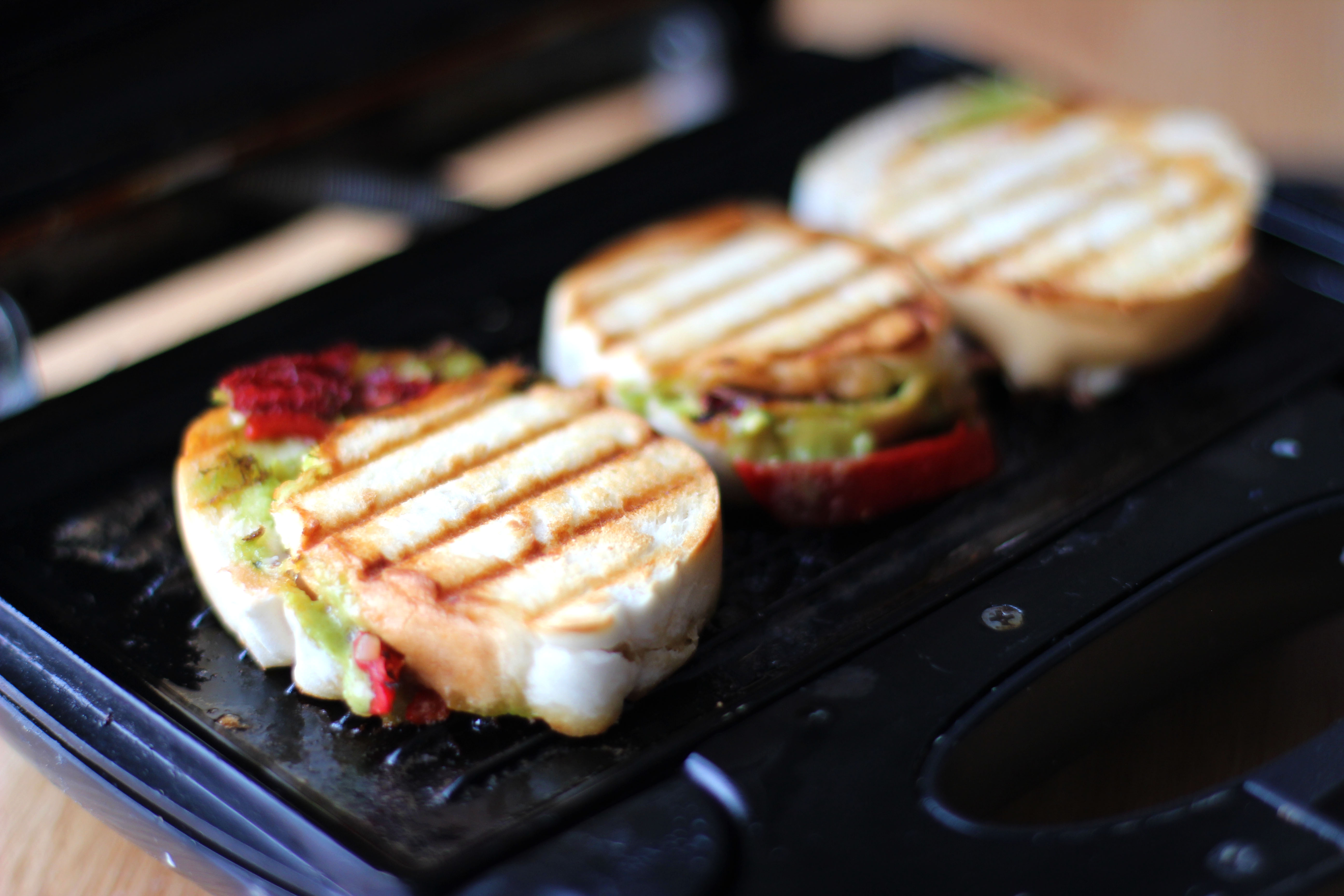 Depending on the size of your sandwich maker, three sandwiches usually fit at once. It is a tight squeeze to close the top, but this helps the outsides of the panini to brown well. Most sandwich makers have an indicator light to let you know when the food is cooked, and for my maker, that takes about four minutes. Once the sandwiches are cooked, leave them in the maker for a few minutes so that it doesn’t smoke profusely when you open it. (Setting off the smoke alarm in a dorm room is never a pleasant experience. My dorm always has a few false smoke alarms due to burnt popcorn every year. Don’t be THAT person.)