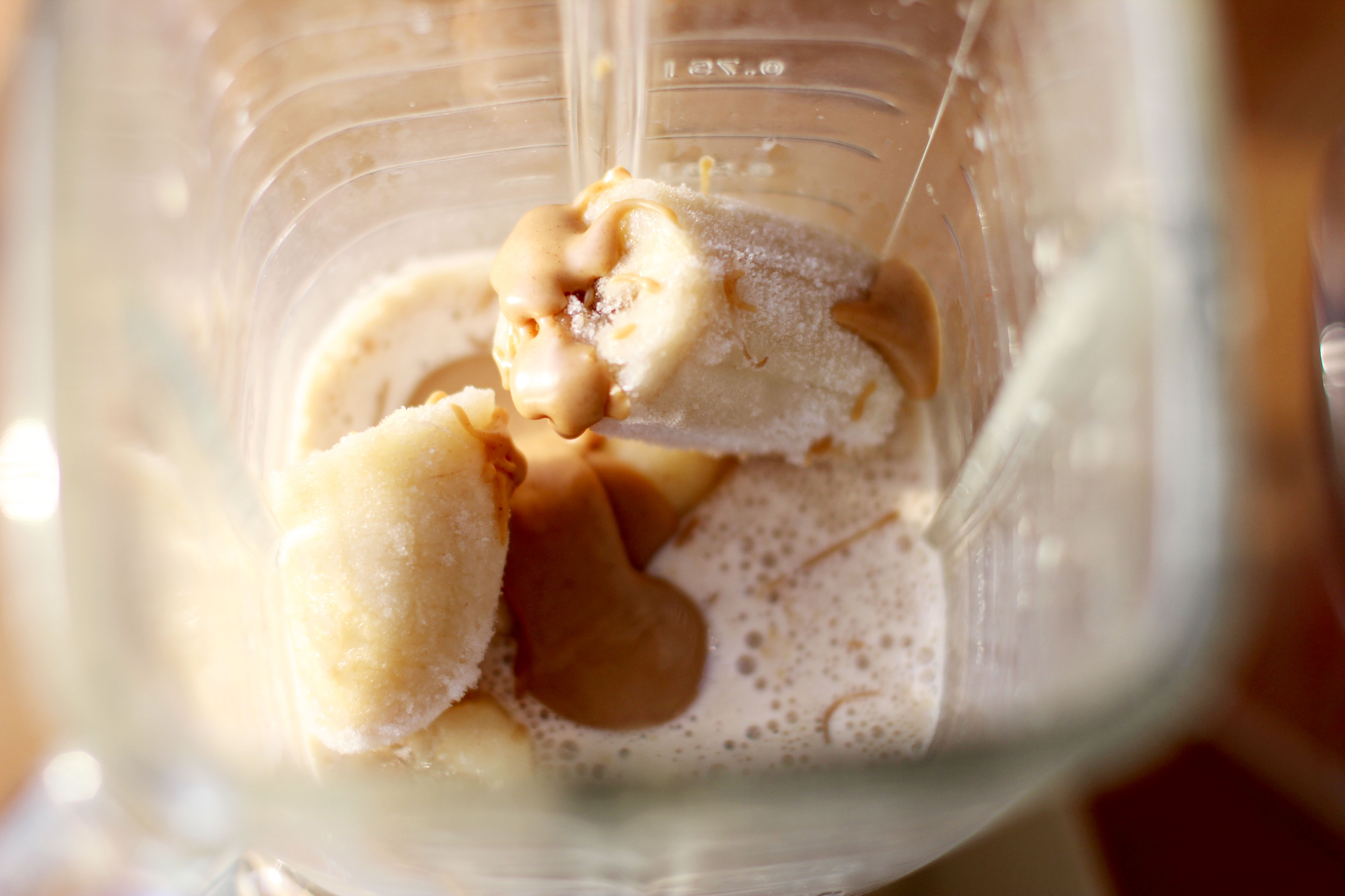 Even if using a creamy version of peanut butter, I always had the problem of it clumping together in the shake and not getting equally incorporated. Fix this by microwaving it for 30 seconds. Then the peanut butter pours smoothly into the blender and gets evenly distributed throughout the shake.